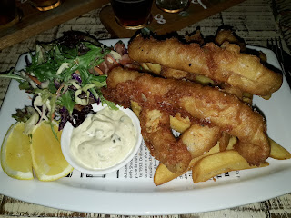 Auf den Zapfhähnen finden sich zwölf verschiedene Biere, und das beste: es gibt ein "Beer Paddle", ein Brett mit vier Löchern, passend für je ein Viertelpint-Glas. Man wählt vier Biere aus, der Barkeeper schreibt mit Kreide die Nummern aus der Bierkarte auf's Paddle, zapft und platziert die Gläser entsprechend, und dann: Chin Chin, Therapiebeginn!